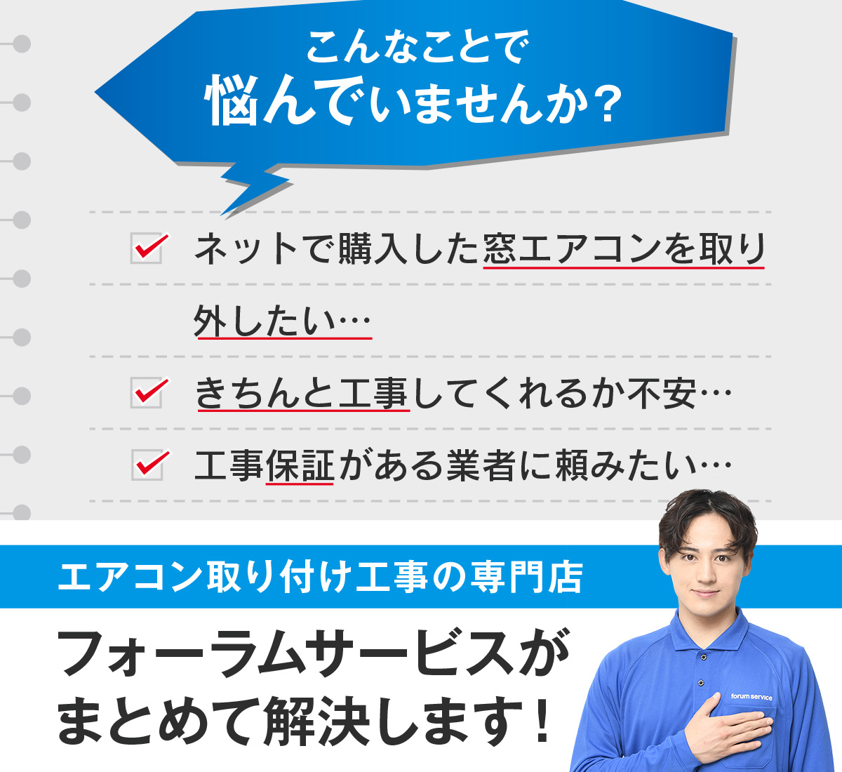 フォーラムサービスはネット注文できるエアコン工事会社として、お客様に愛され続けて13年。創業当初からネットで自動見積り・そのまま注文もできる、かんたん便利で分かりやすいサイトとして評価頂いています。