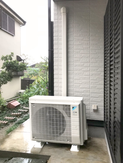 室外機はコンクリート部分に大地置きにて設置しました。室外化粧カバーは外壁色に合わせたアイボリーでお取り付けし、無事施工完了しました。